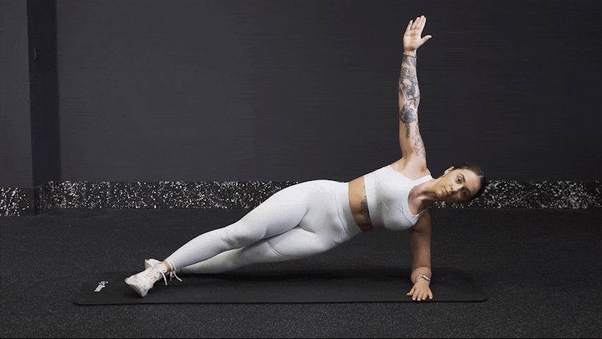 - Αρχική θέση: Ξαπλώστε στο πλάι με τα πόδια τεντωμένα. Κρατήστε τα πόδια σας στοιβαγμένα το ένα πάνω στο άλλο, ή το ένα πίσω από το άλλο. Ενεργοποιήστε το κέντρο σας και ανασηκώστε το σώμα σας στον πήχη σας, ενώ σηκώνετε το άλλο σας χέρι προς το ταβάνι.