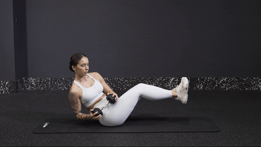 - Αρχική θέση: Καθίστε στο στρώμα σε όρθια στάση, με ελαφριά κλίση της πλάτης προς τα πίσω. Το κεφάλι σας πρέπει να είναι ευθυγραμμισμένο με τη σπονδυλική σας στήλη. Λυγίστε τα γόνατα σας σε γωνία 90 μοιρών και σηκώστε τα από το έδαφος μέχρι οι κνήμες σας να είναι παράλληλες με το έδαφος. Οι αρχάριοι μπορούν τα σηκώσουν τα πόδια τους μόλις λίγα εκατοστά από το πάτωμα ή και να τα κρατήσουν εκεί. Πάρτε έναν αλτήρα και κρατήστε τον σταθερά, με τα δύο σας χέρια, από τις άκρες του.