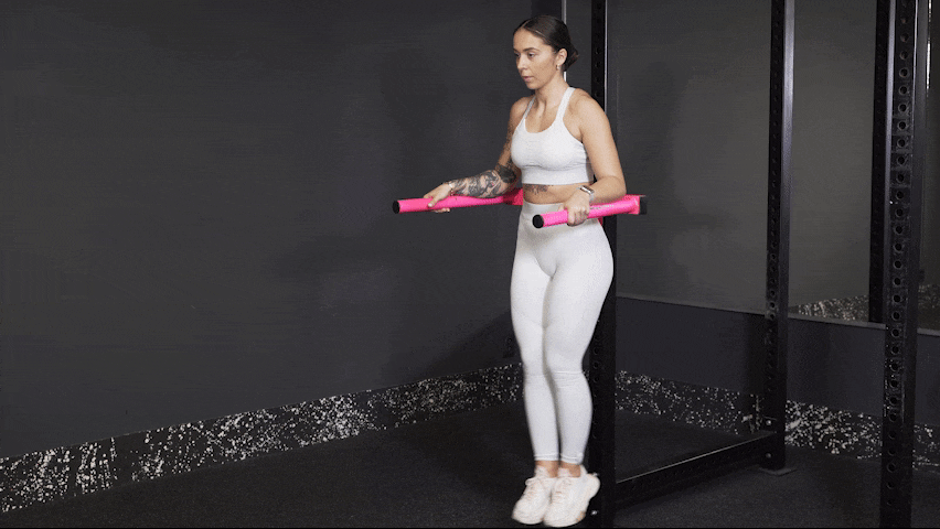 Η αρχική θέση παραμένει ίδια. Η διαφορά είναι ότι κρατάτε ένα δίσκο βάρους, έναν αλτήρα ή το kettlebell, με τα δύο χέρια μπροστά στο στήθος σας. Καθώς κινείστε προς τα πάνω, ισιώνετε σταδιακά τα χέρια σας, μέχρι να τεντώσουν πλήρως. Στη συνέχεια, επιστρέφετε ελεγχόμενα στην αρχική θέση και συνεχίζετε με τις υπόλοιπες επαναλήψεις.